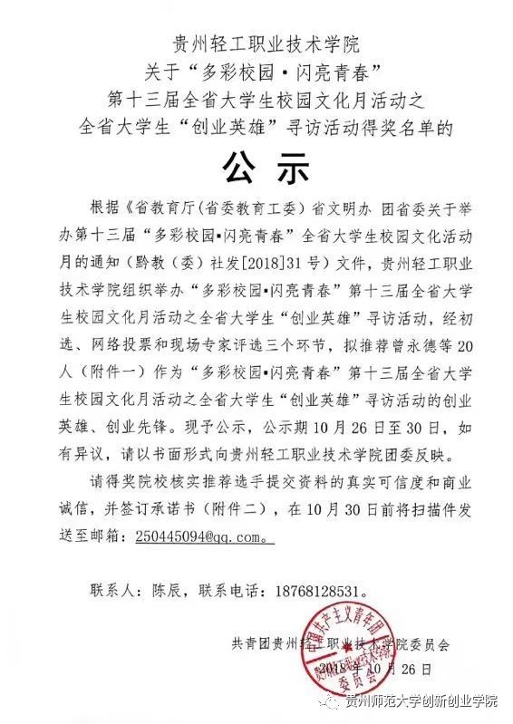 根据《省教育厅(省委教育工委)省文明办团省委关于举办第十三届“多彩校园*闪亮青春”全省老员工校园文化活动月的通知(黔教(委)社发[2018]31 号)文件,贵州轻工职业技术公司承办“多彩校园"闪亮青春”第十三届全省老员工校园文化月活动之全省老员工“创业英雄”寻访活动中,公司两位员工、员工入选。