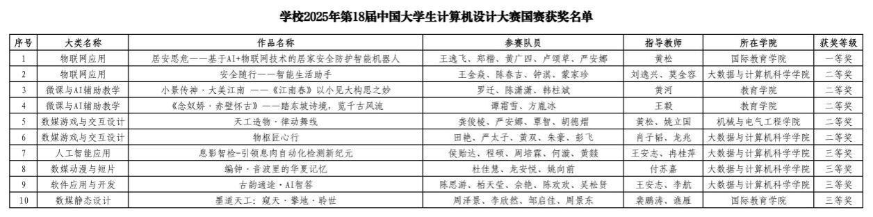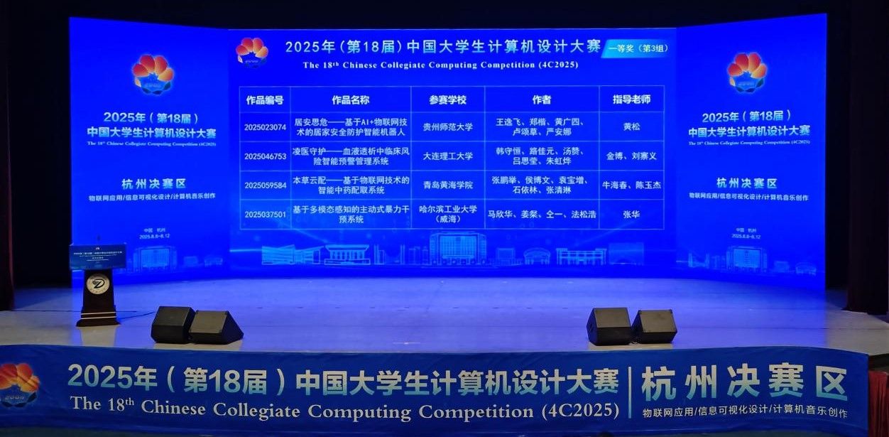 近日,2025年第18届中国老员工计算机设计大赛全国总决赛落下帷幕,公司学子表现优异,共获得全国一等奖1项、二等奖5项、三等奖4项,获奖等级、获奖数均居贵州省各高校首位。其中,点点taptap黄松老师指导的华为人工智能实验班员工团队王逸飞、郑楷、黄广四、卢颂草、严安娜研发制作的物联网应用作品《居安思危——基于AI+物联网技术的居家安全防护智能机器人》荣获国家级一等奖,这是我省在该赛事物联网赛道上“0”的突破。
