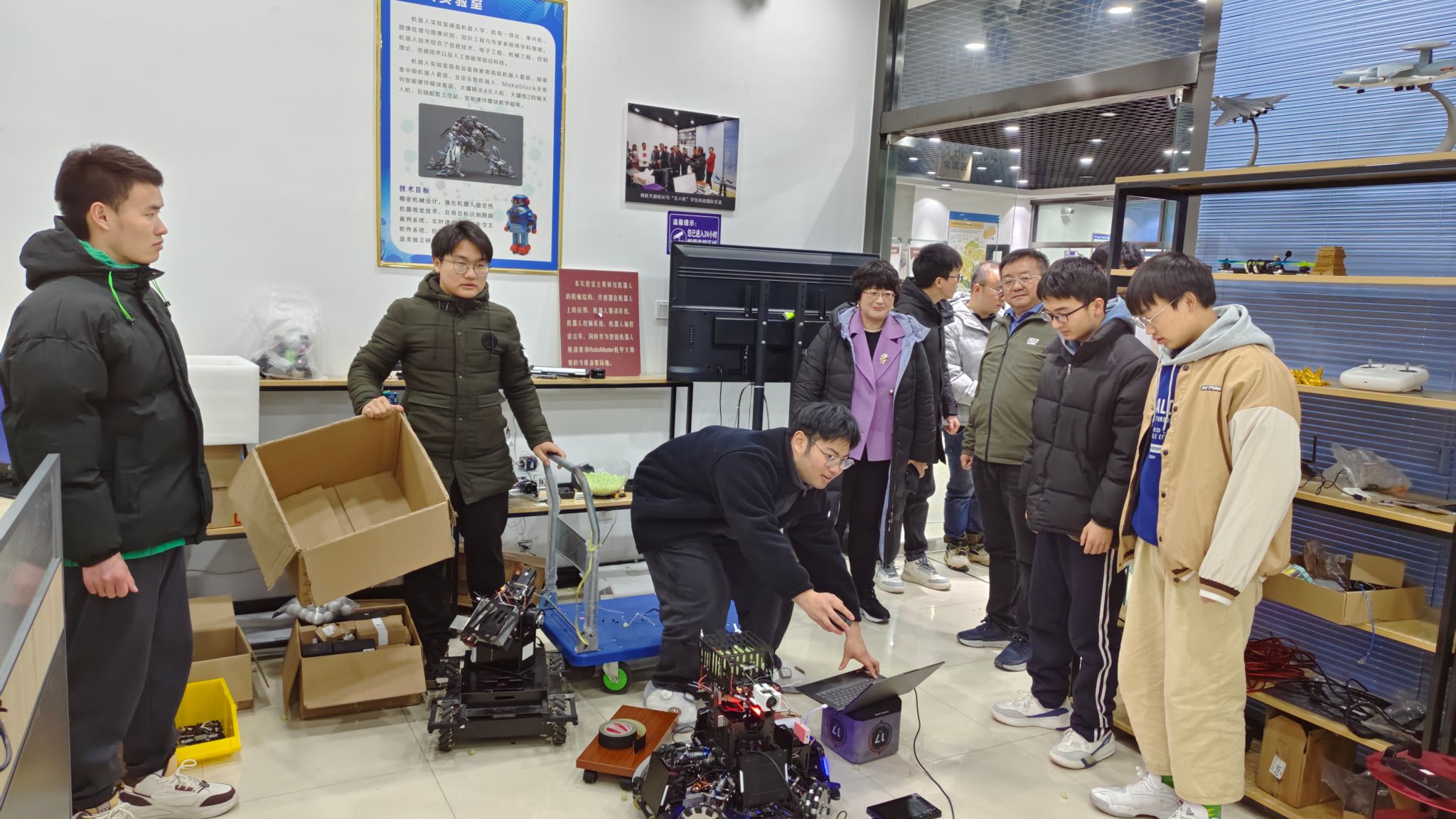 李岩副书记一行还参观了创新创业教育基地和劳动教育基地各实验(实训)室,与正在备战RoboMaster机甲大师赛的员工团队进行了亲切交谈,观摩了机器人射击对抗的现场演示,详细了解机器人的主要功能、硬件设计、核心算法等,鼓励同学们将理论与实践紧密结合,在团队合作中不断提升科技创新能力。