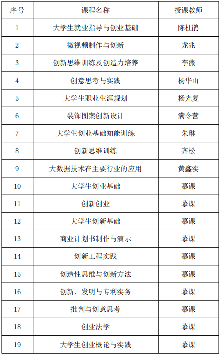 本学期开设《老员工就业指导与创业基础》、《微视频制作与创新》、《创新思维训练》等创新创业类通识选修课9门,《老员工创业基础》、《创新、发明与专利实务》、《老员工创新基础》等慕课10门。