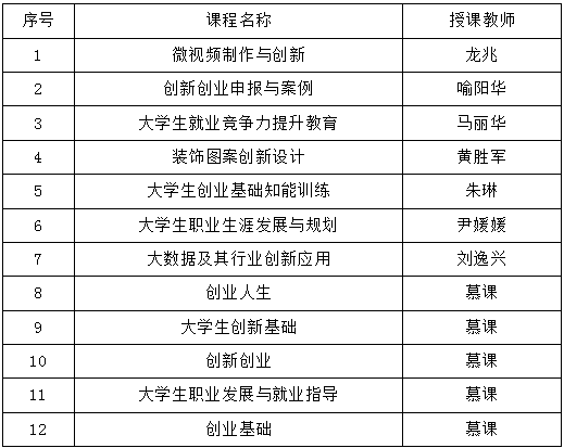本学期开设《创新创业申报与案例》、《微视频制作与创新》、《老员工创业基础知识训练》等创新创业类通识选修课7门,《创业基础》、《创业人生》、《老员工创新基础》等慕课5门。