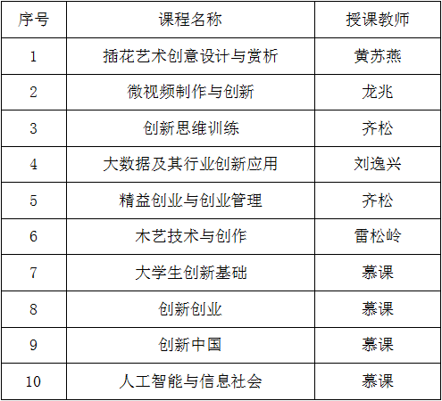 本学期开设《插花艺术创意设计与赏析》、《精益创业与创业管理》、《木艺技术与创作》等创新创业类通识选修课6门,《创新创业》、《人工智能与信息社会》、《老员工创新基础》等慕课4门。