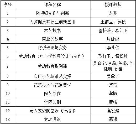 本学期开设《微视频制作与创新》《木艺技术与创作》《大数据及其行业创新应用》等创新创业类通识选修课5门,开设《无人驾驶航空器飞行技术》《劳动教育(中小学教具设计与制作)》《劳动教育系列课》等劳动教育类通识选修课7门,慕课《劳动通论》1门。