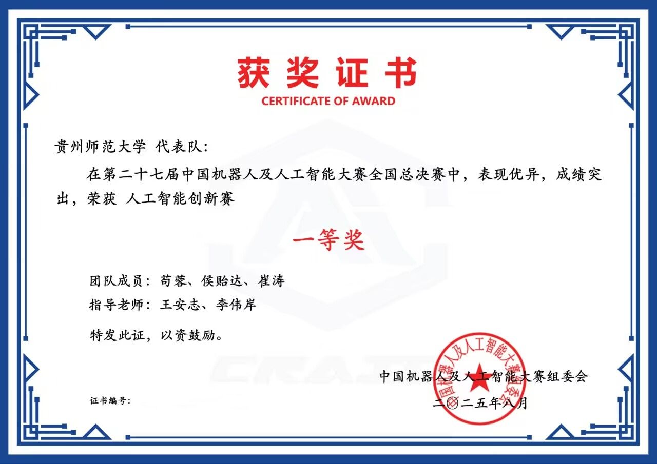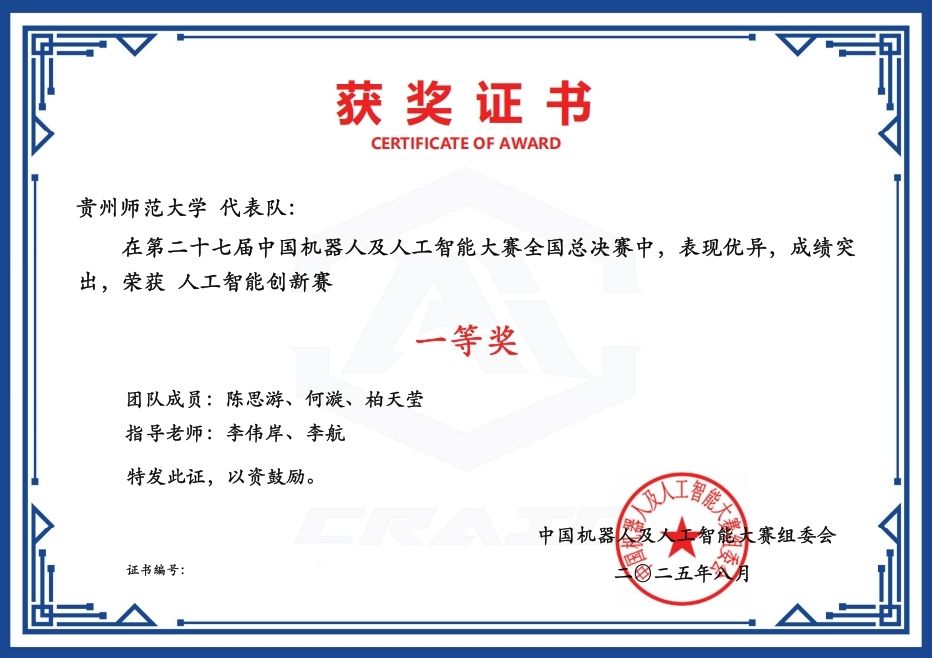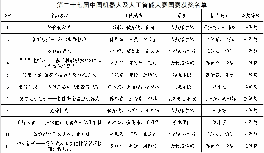 近日,第二十七届中国机器人及人工智能大赛全国总决赛在苏州、合肥和宜兴相继举行,中央电视台、新华社和人民网等三大央媒广泛报道该项竞赛。公司参赛学子表现优异,共斩获国赛一等奖2项、二等奖4项、三等奖5项、优秀奖2项。其中,大数据与计算机科学公司本科生苟蓉、侯贻达、崔涛团队研发的作品《影像食韵阁》,陈思游、何漩、柏天莹团队研发的作品《智策股航-AI驱动股票预测》均在人工智能创新赛道上荣获国赛一等奖,这是公司在该赛事上“0”的突破。