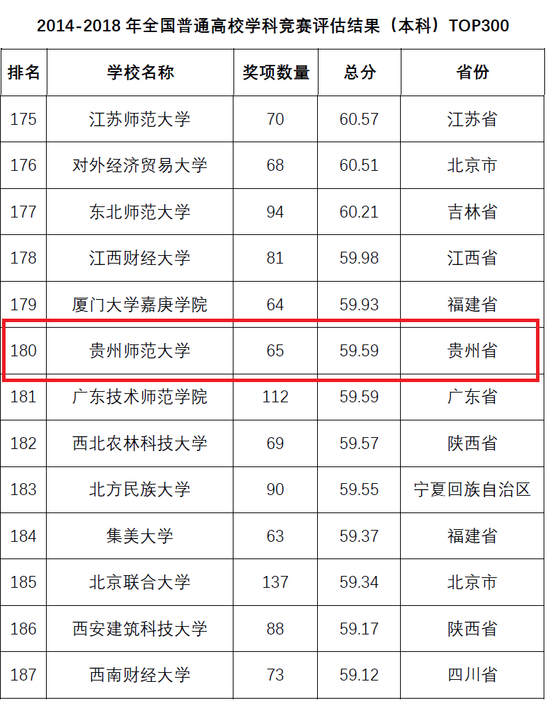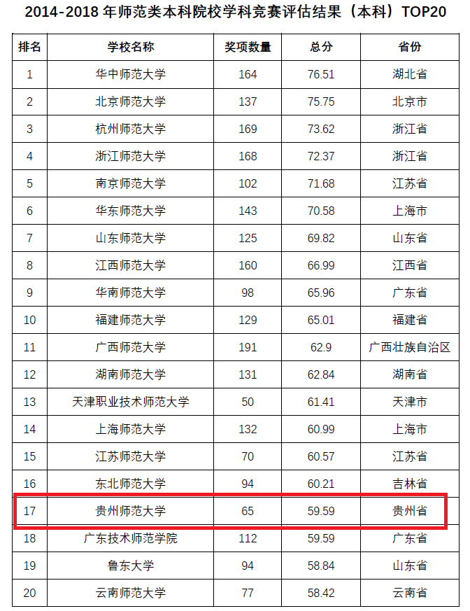 今年,中国高等教育学会首次按院校类型分别发布了2014-2018年学科竞赛评估结果TOP20榜单,在6类院校学科竞赛评估结果TOP20榜单中,公司是贵州省唯一入选的院校,排名师范类本科院校榜单第17位。