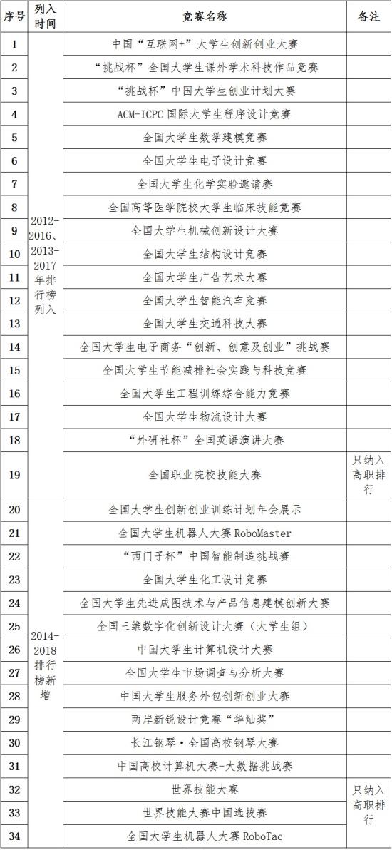 自2017年12月14日中国高等教育学会“高校竞赛评估与管理体系”专家工作组在杭州发布2012-2016年我国普通高校学科竞赛排行榜以来,学会针对高校竞赛研究工作正式拉开序幕。2019年1月19日,高校竞赛评估排行榜专家委员会第二次会议在杭州召开,15项竞赛新增列入2014-2018年高校竞赛排行榜,其中本科类竞赛12项,高职类竞赛3项,列入排行榜的竞赛项目从原来的“18+1”项转变为“30+4”项。