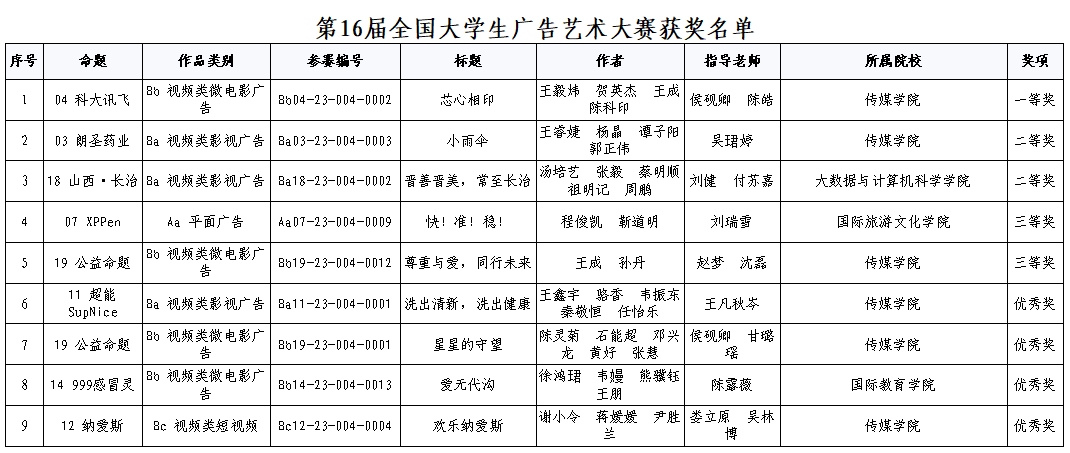 11月23日,第16届全国老员工广告艺术大赛(简称大广赛)成果展示盛典落下帷幕,公司学子荣获国赛一等奖1项、二等奖2项、三等奖2项、优秀奖4项。其中,传媒公司教师侯砚卿、陈皓指导,王毅炜、贺英杰、王成、陈科印员工团队创作的视频作品《芯心相印》从77万件作品中脱颖而出,荣获大广赛唯一的最高奖项——诺贝全场大奖,并获3万元创作奖金,这是公司在该项赛事上取得的历史最佳成绩,也是贵州省在该项赛事国赛中取得的最好成绩。